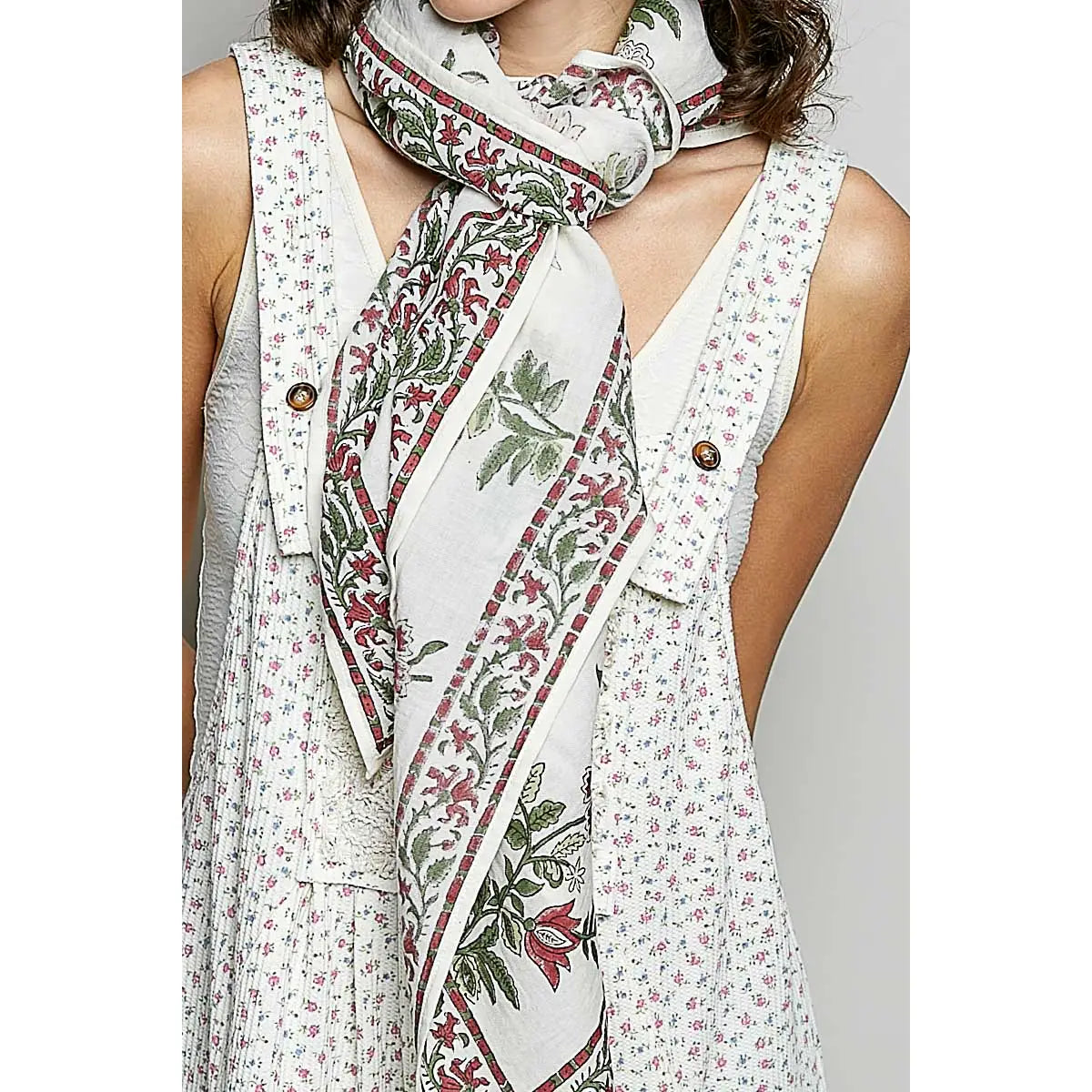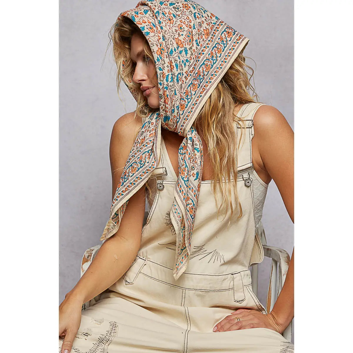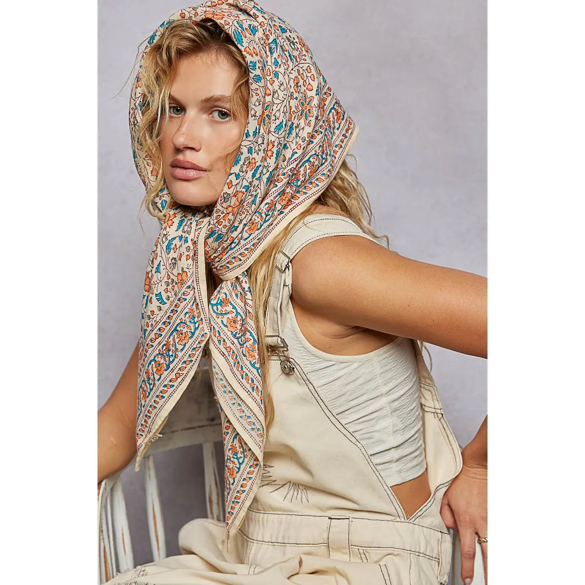 Lightweight printed woven scarf featuring a soft, airy texture and an elegant allover pattern. Designed with a versatile square shape and refined border detailing, offering effortless styling as a neck scarf, shawl, or wrap for a polished, feminine finish.