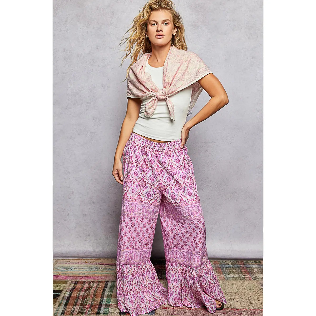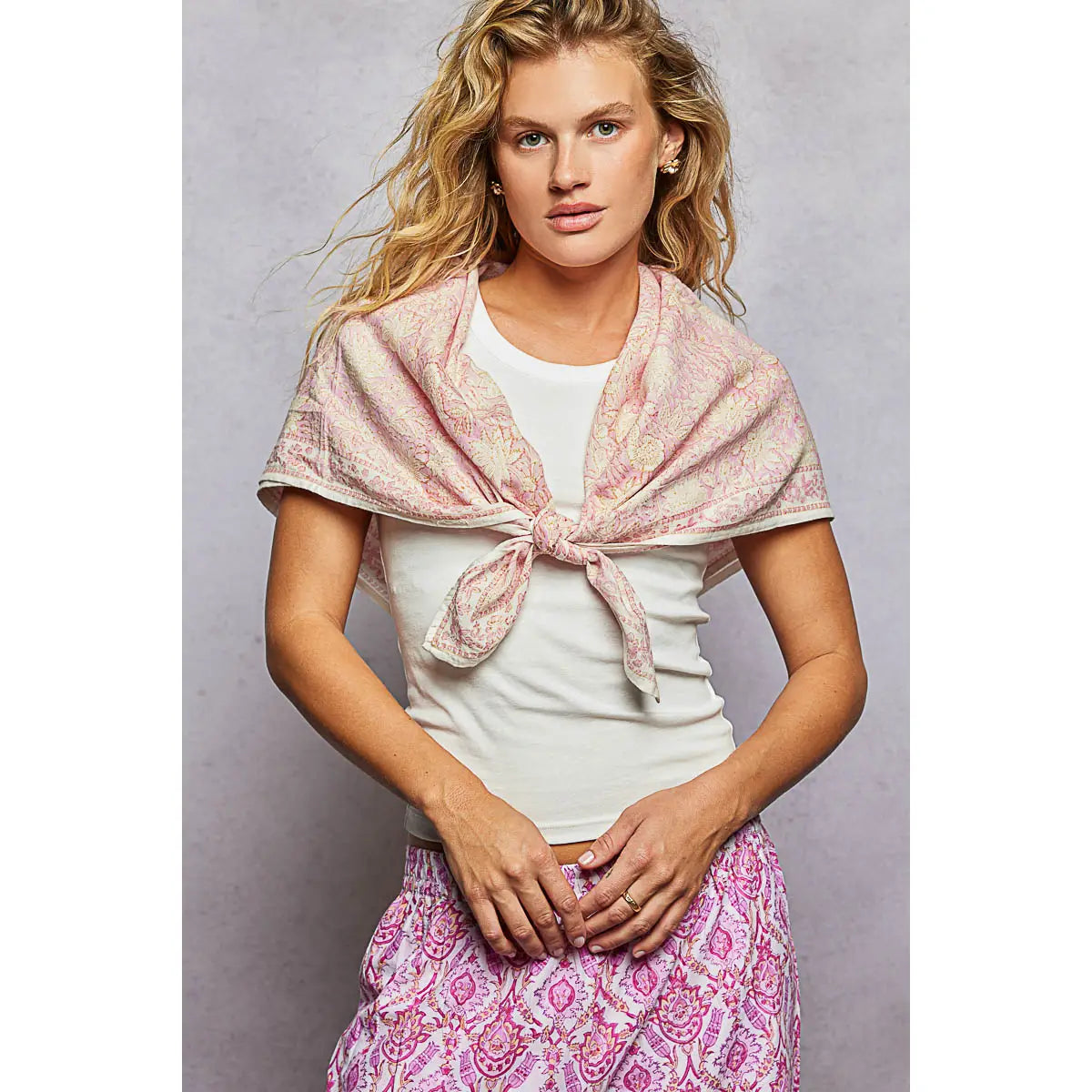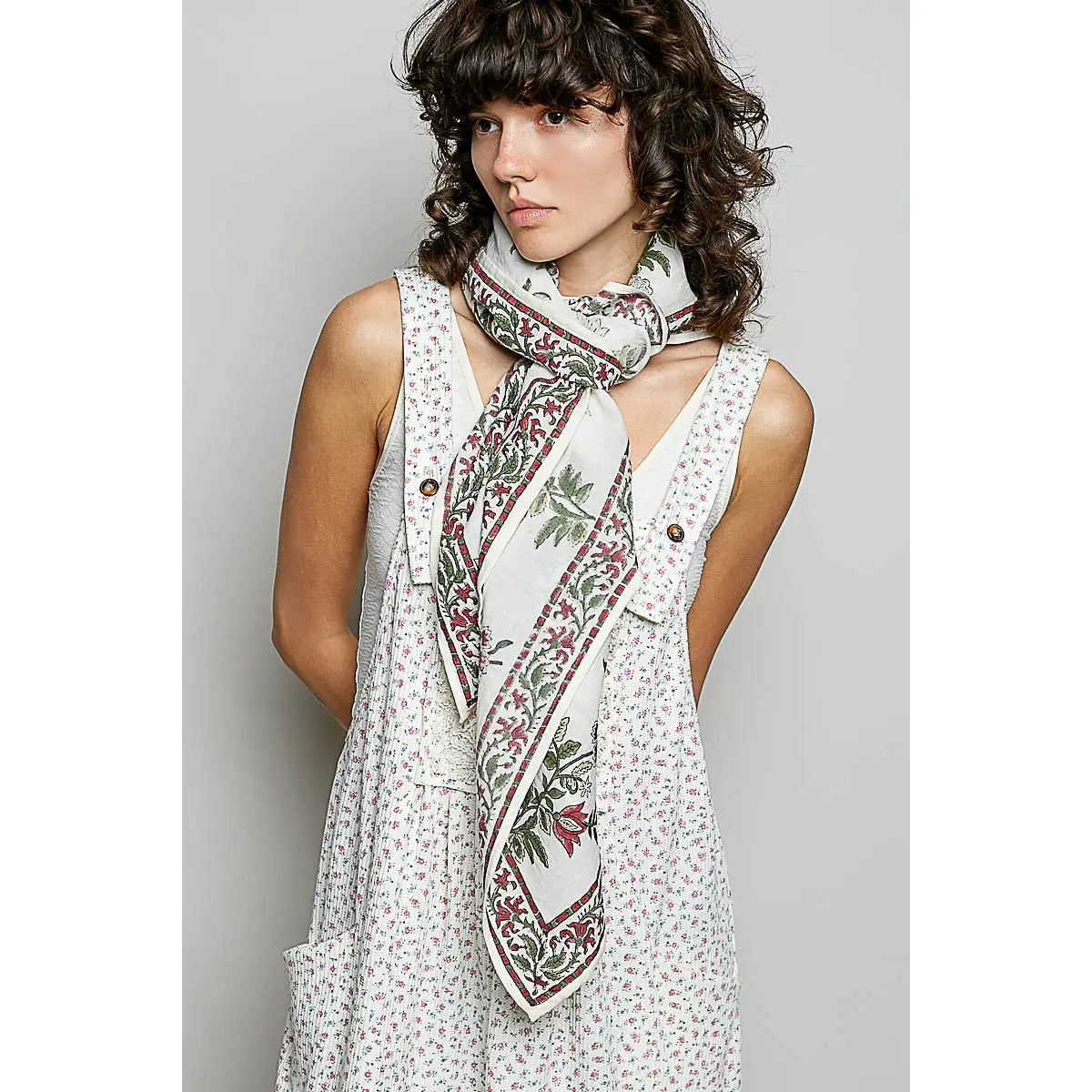 Lightweight printed woven scarf featuring a soft, airy texture and an elegant allover pattern. Designed with a versatile square shape and refined border detailing, offering effortless styling as a neck scarf, shawl, or wrap for a polished, feminine finish.