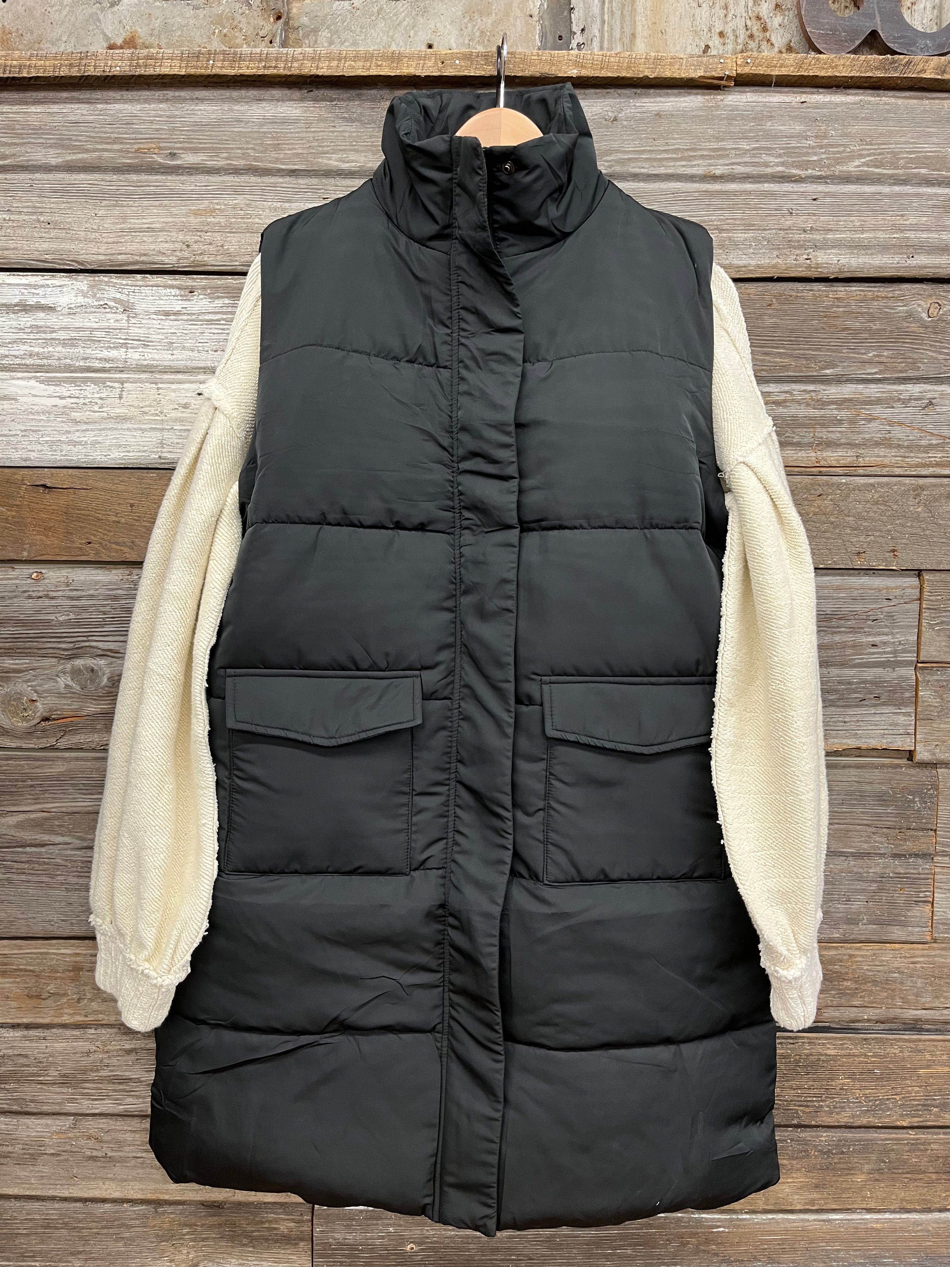 Meet your new cold-weather best friend: the Cheryl Long Puffer Vest! With a full zip and snap closure, it’s ready to keep out the chill no matter what the day throws at you. The cozy mock neck wraps you in warmth while the roomy pockets hold your essentials (or secret snacks). Puffy, plush, and perfectly playful, this vest makes layering fun and keeps you comfy from morning coffee to evening strolls. Stay warm, stay adventurous!