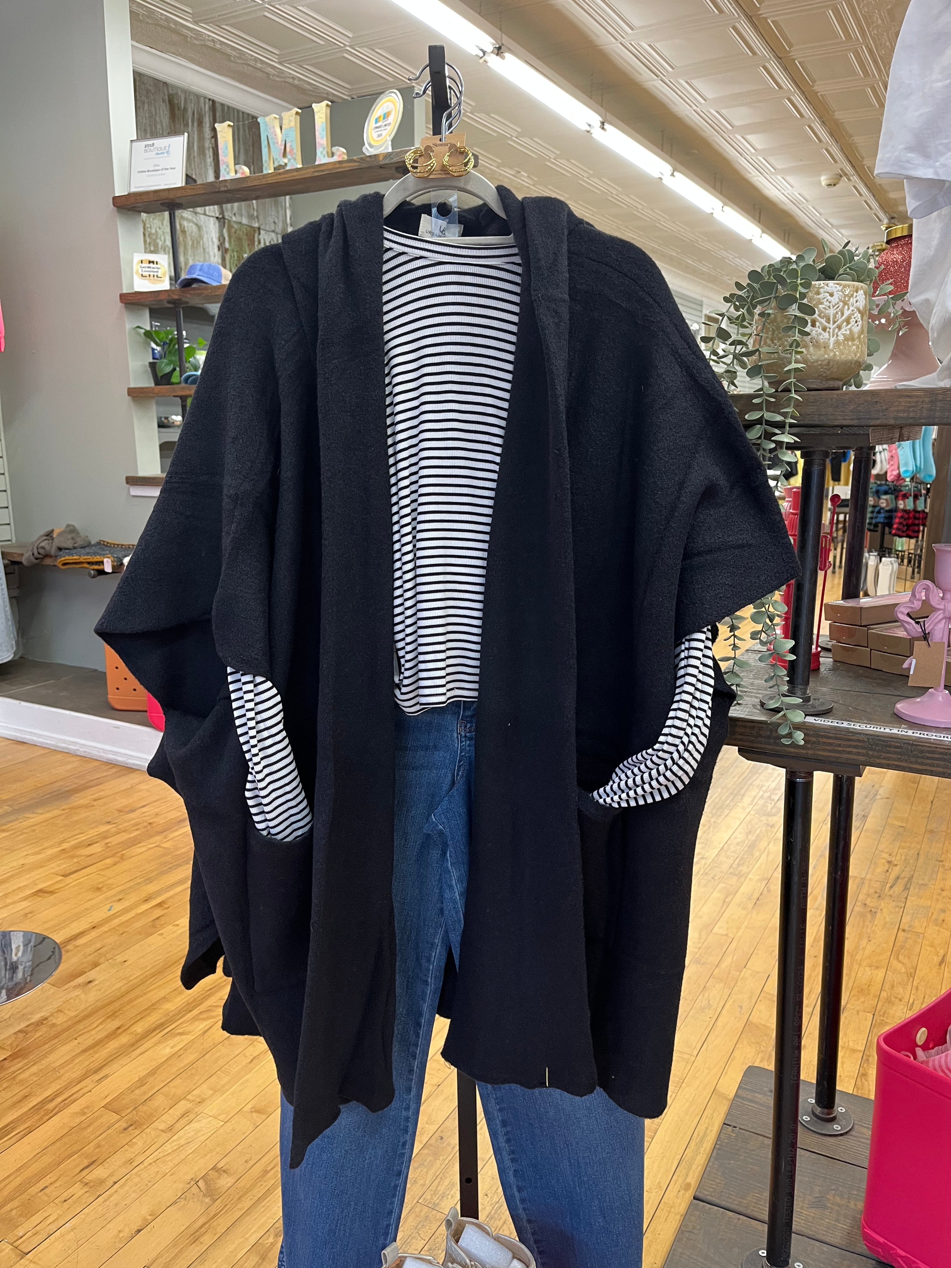 Meet your new layering obsession—the Diana Poncho Cardigan. This sleeveless hooded wonder glides over everything in your closet, adding instant flair without the fuss. Wrapped in chic black, it's the ultimate throw-on piece for building outfits that feel intentional and fun. Whether you're stacking it over a tee or pairing it with a dress, this poncho cardigan keeps things breezy, bold, and endlessly versatile.