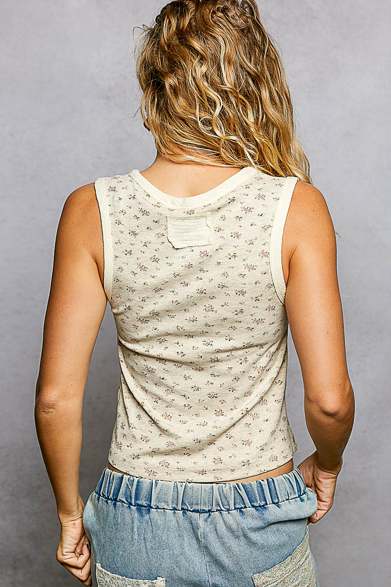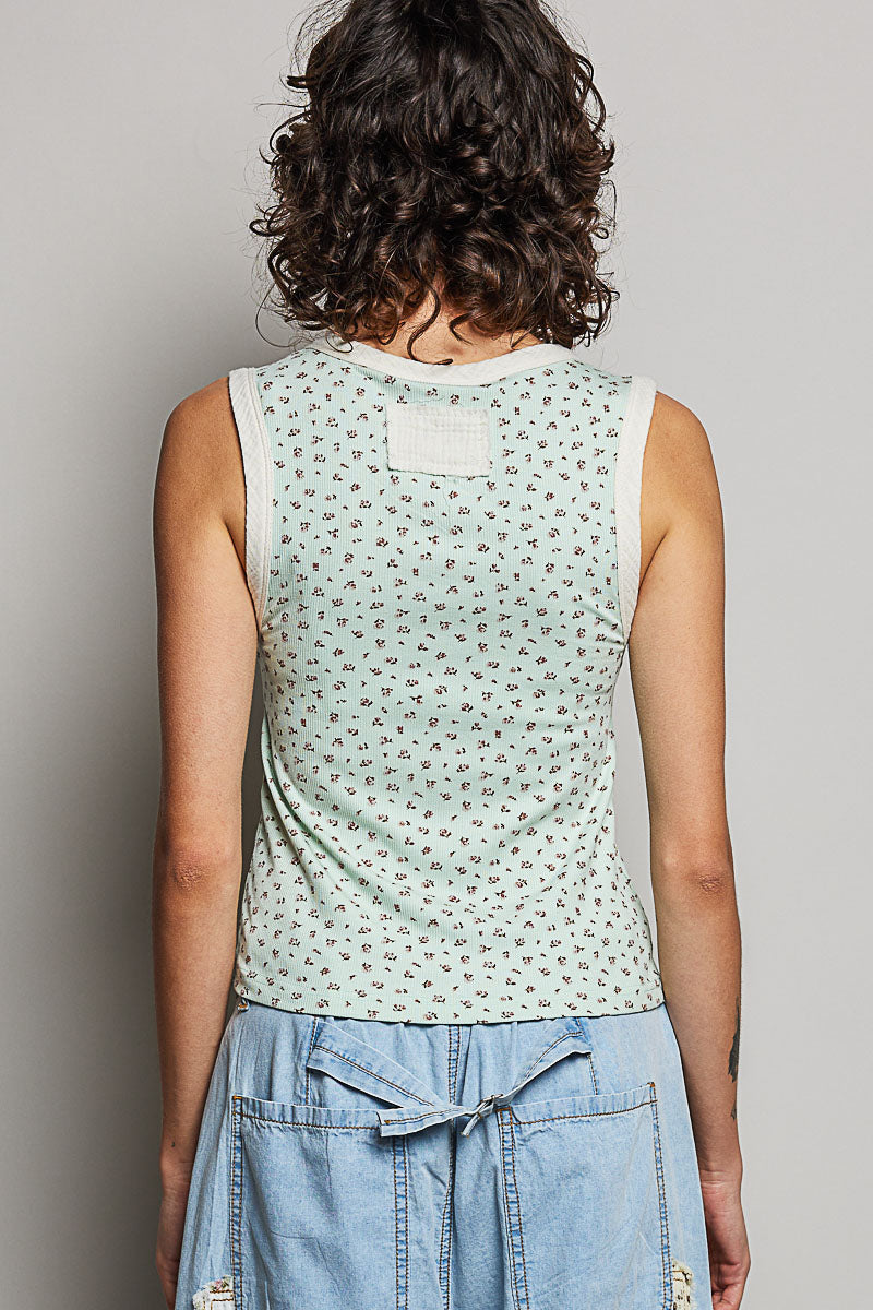 Round-neck slim-fit sleeveless knit top featuring a floral print, half placket with metal buttons, and exposed outseam and raw-edge details. Finished with vintage washing, this lightweight top offers a feminine, textured look perfect for casual styling and easy layering.