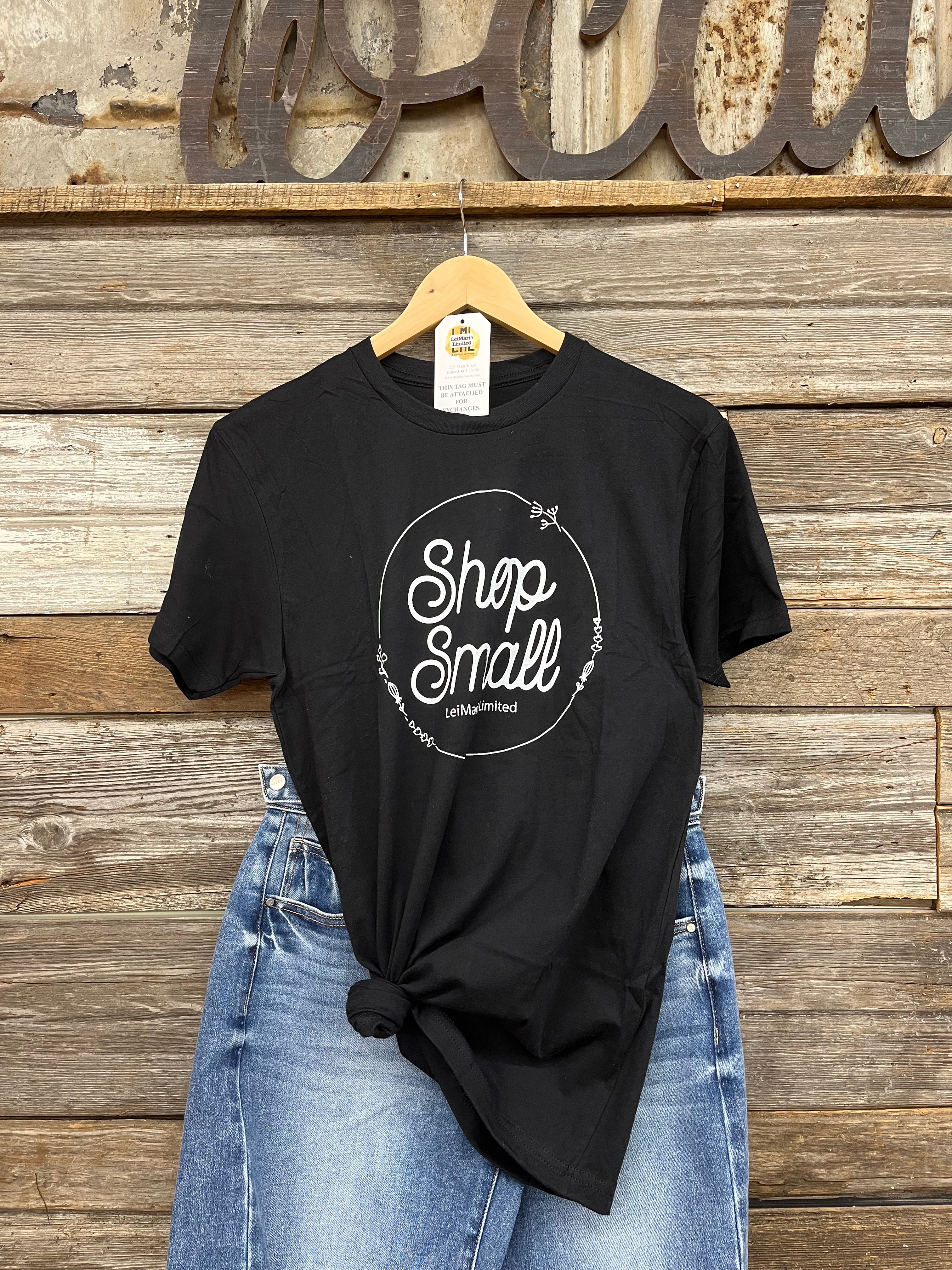 Support your community in style with this soft, comfortable black tee featuring a charming "Shop Small" script paired with our name. Perfect for spreading the word about local love, this everyday essential combines quality fabric with a message that matters. Wear it proudly and inspire others to shop small.